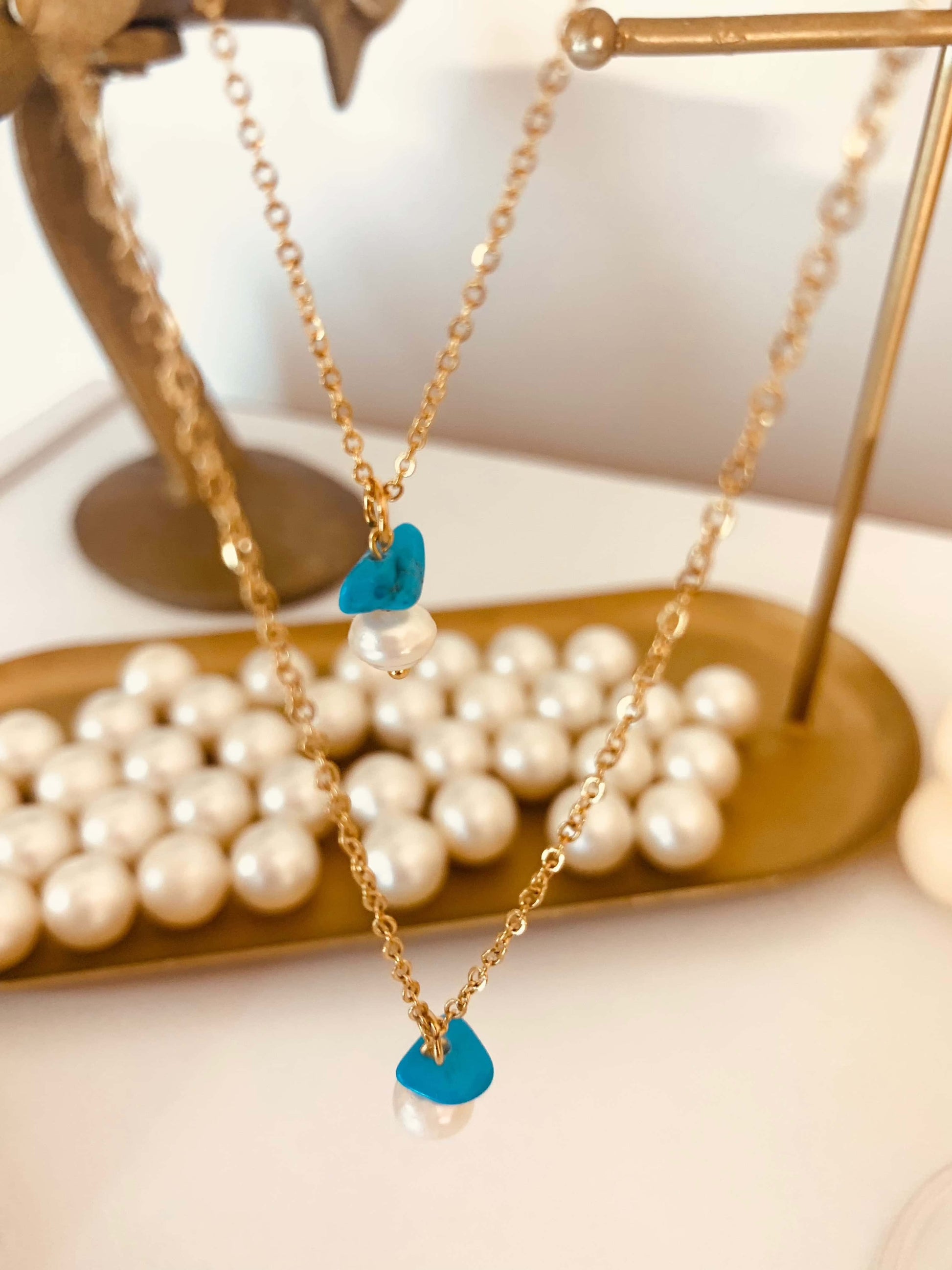 Delicado collar elaborado a mano en acero inoxidable con detalles de Perla natural y turquesa . Ideal para un regalito o para consentirte.