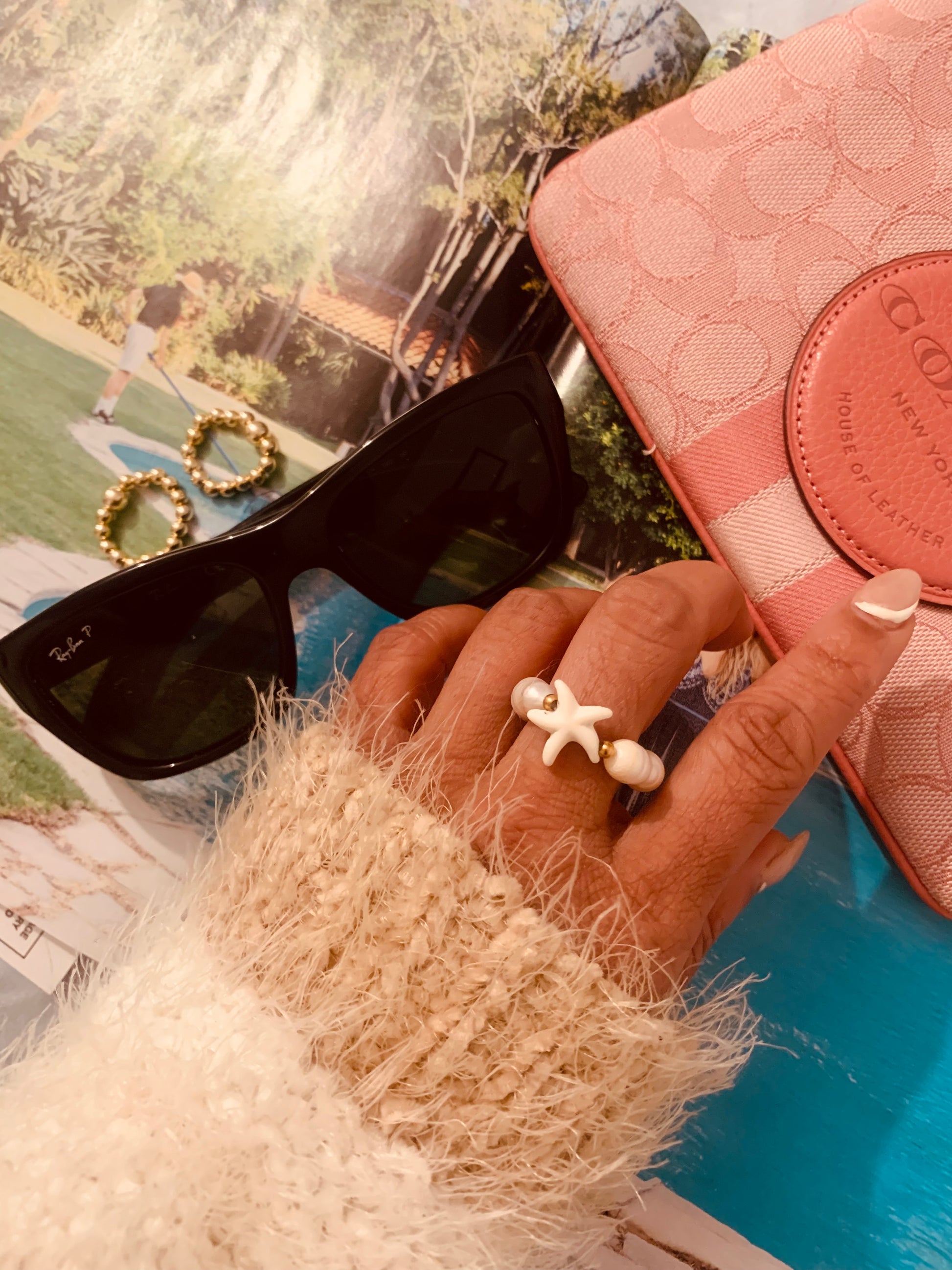"Obtén un estilo único y elegante con nuestro Bora Bora Ring. Confeccionado con perlas naturales y una estrella volcánica, el anillo tiene un tamaño de 8 pulgadas. Adorna tus manos y destaca entre la multitud con este accesorio de alta calidad."