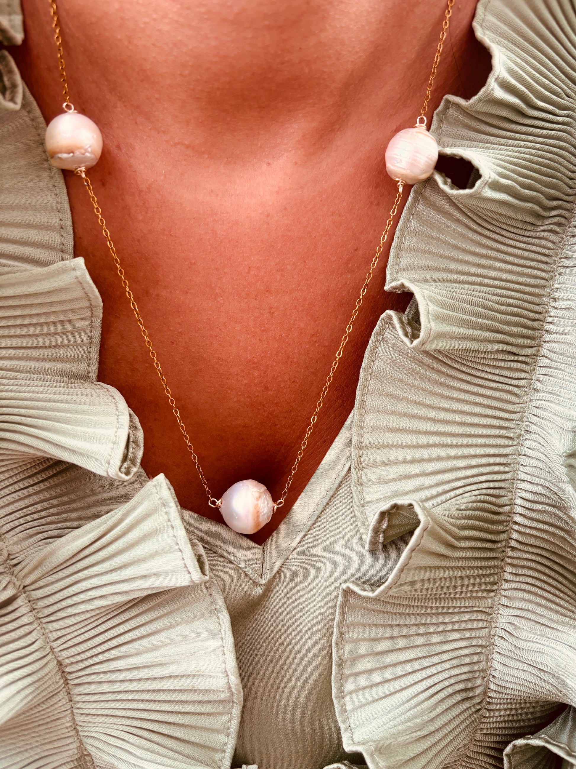 Con la cadena Brilla Bella, tendrás una pieza de joyería única con perlas grandes barrocas de 20" en acero inoxidable. Su elegante diseño te hará destacar en cualquier ocasión. ¡Luce sofisticada y a la moda con esta hermosa cadena!