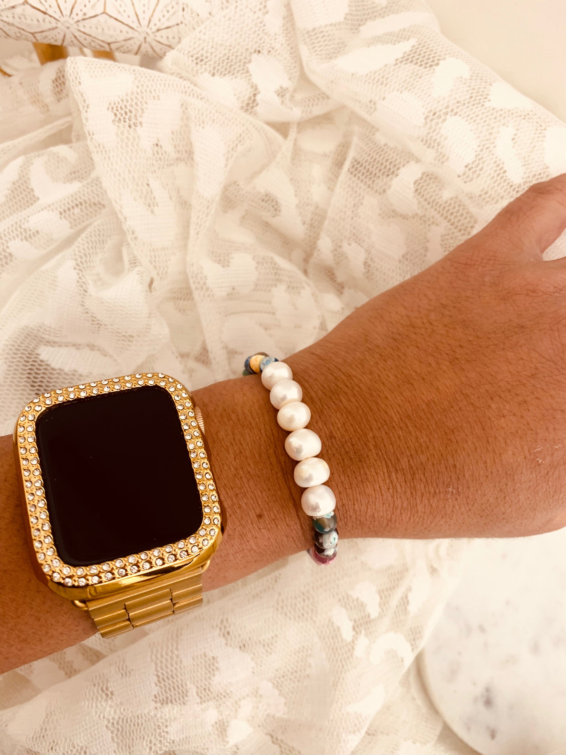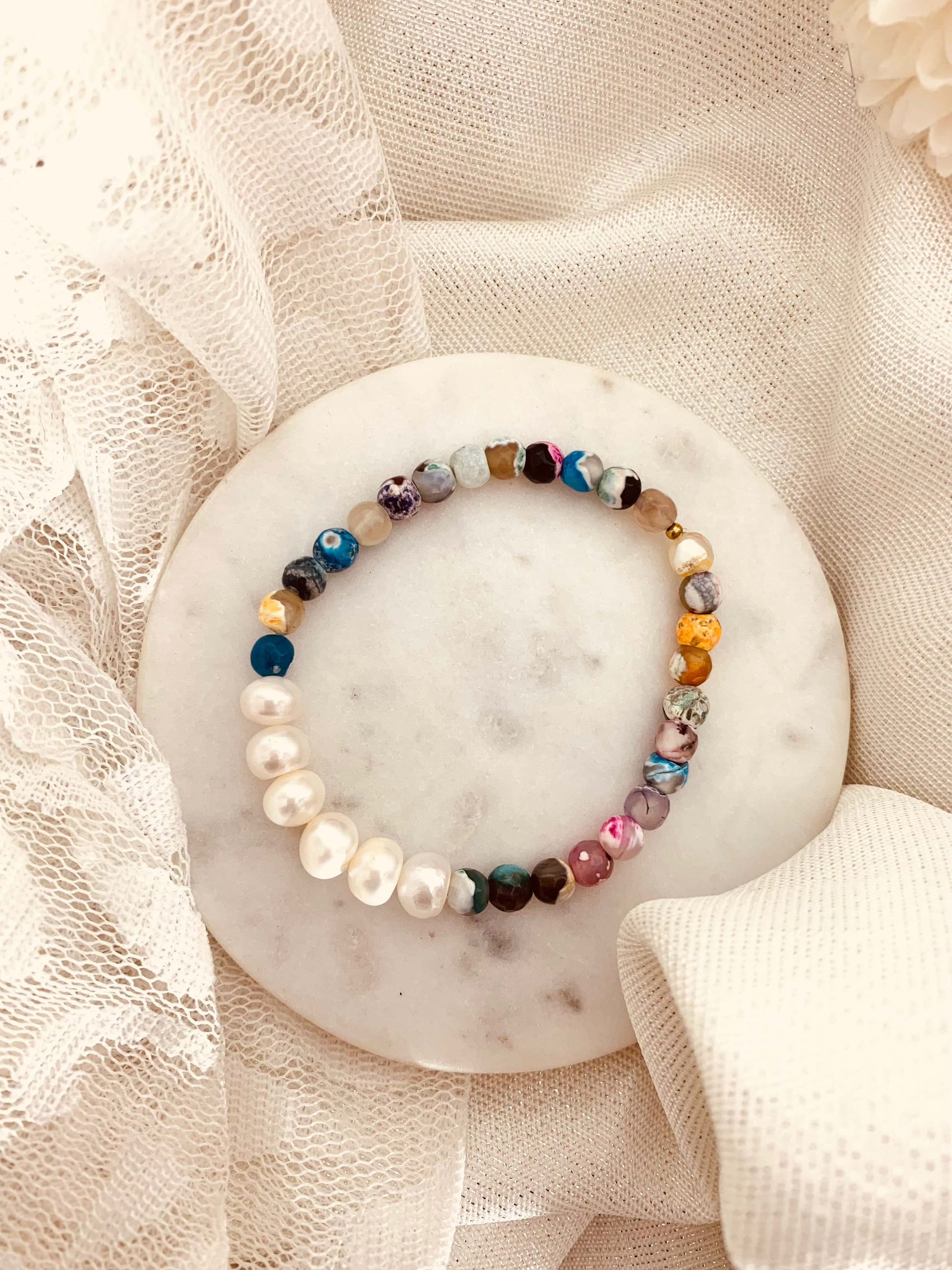 Delicada pulsera hecho a mano con Perlas cultivadas y Ágata . Definitivamente darás un toque de alegría a tu día con este espectacular brazalete . Combina con otras crear un look espectacular. Ideal para ropa casual, este es una buena opción para regalar a esa amiga que alegra tus días, hermana o madre.