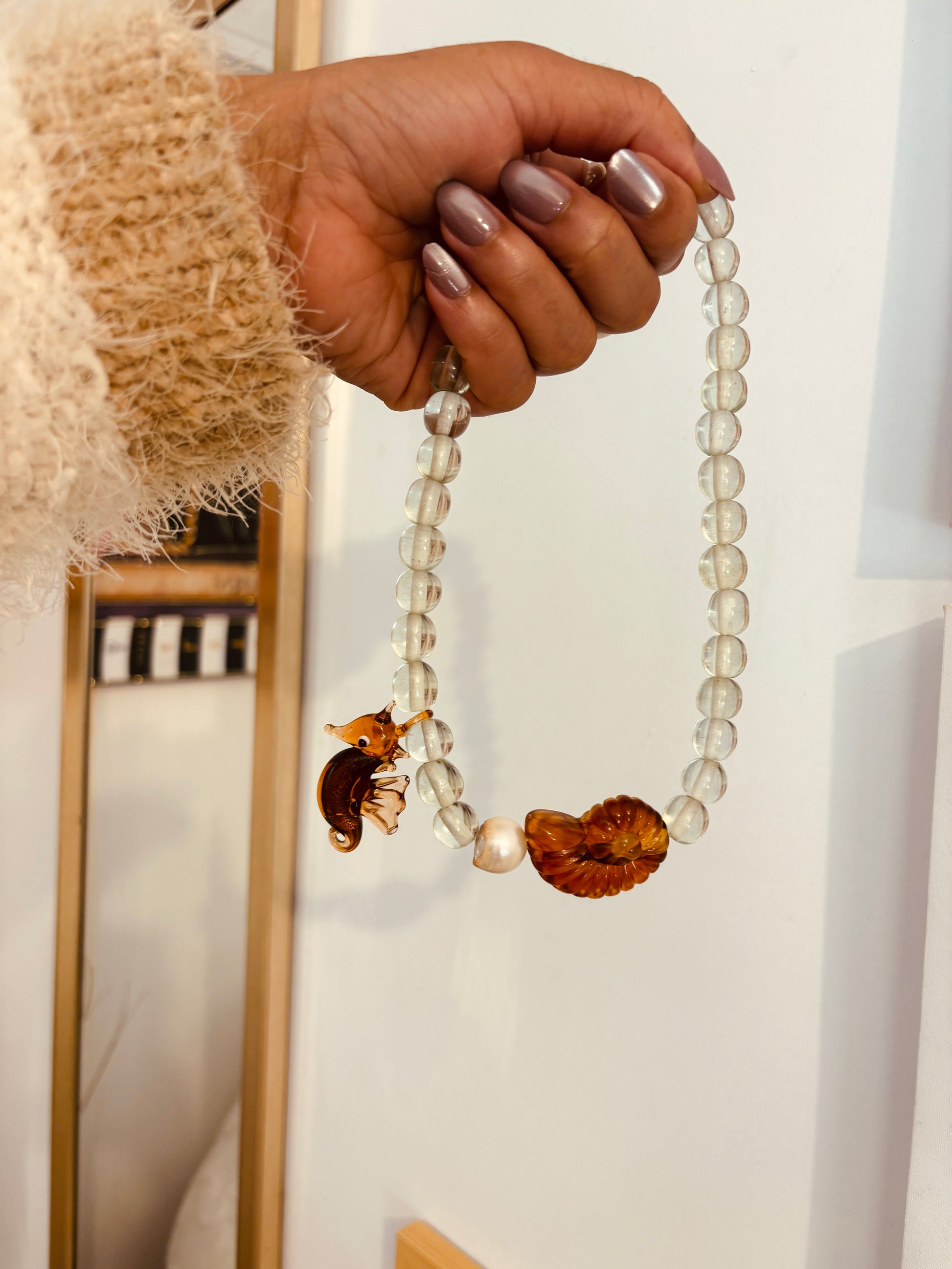 Este collar de playa cuenta con piedras claras en una elegante collar de tono marrón junto con detalles de caballitos de mar y conchas. El tamaño de 15 pulgadas le da un toque único a este collar, perfecto para cualquier ocasión en la costa. Mantén tu estilo oceánico con este collar de playa.