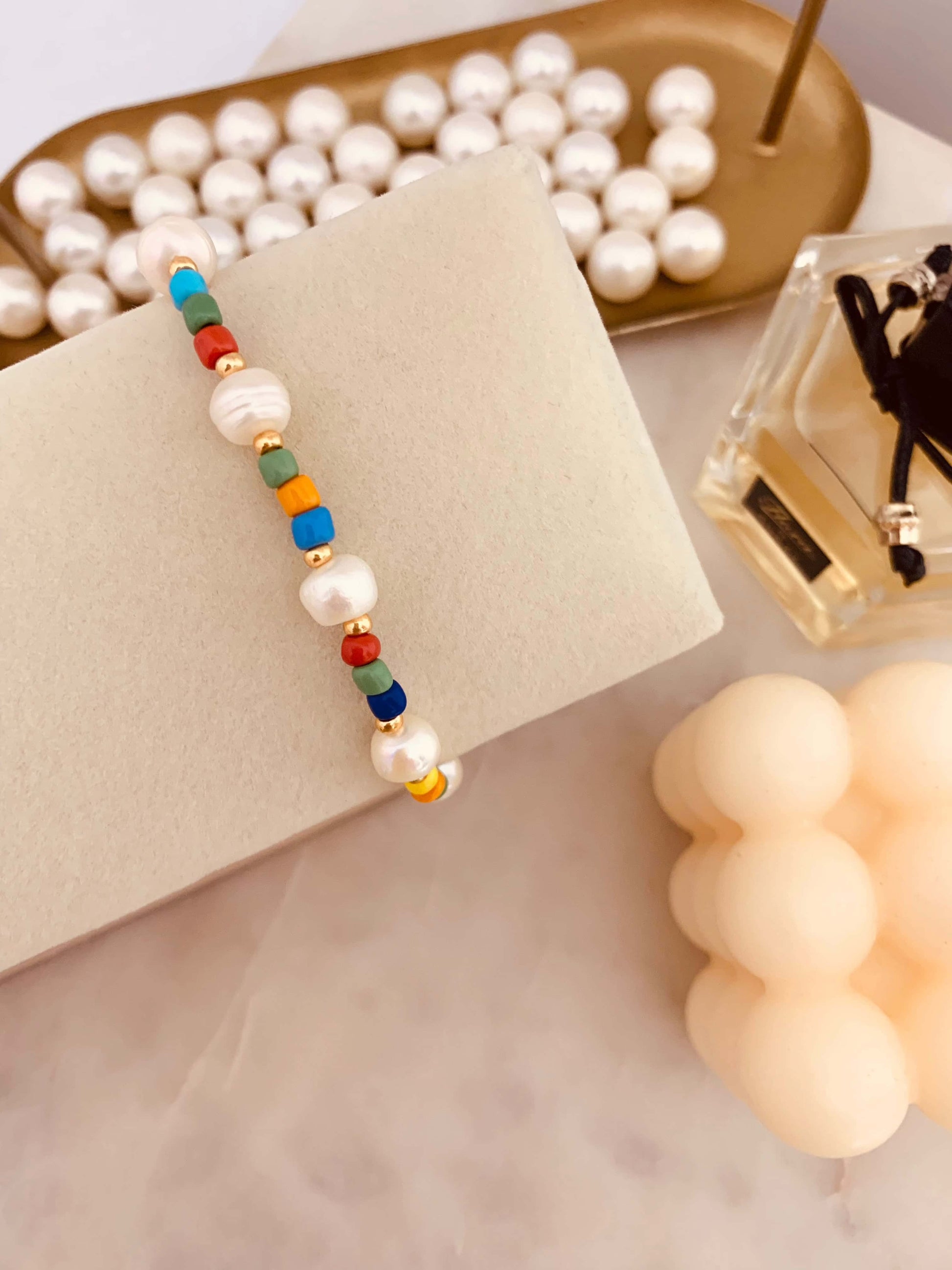 Delicado brazalete elaborado a mano con perlas cultivada y seed beads. Elástico combina con tus jeans favoritos.
