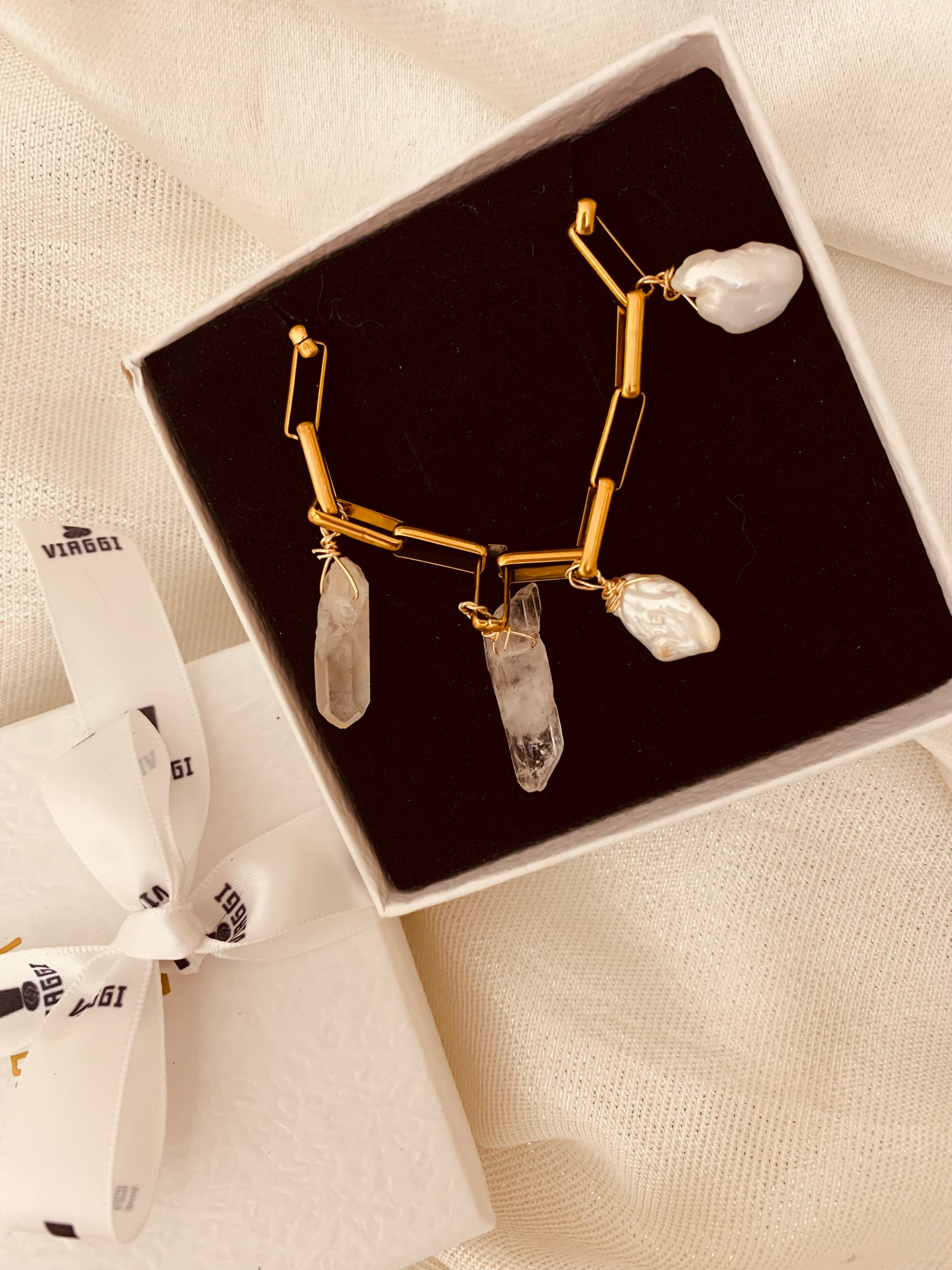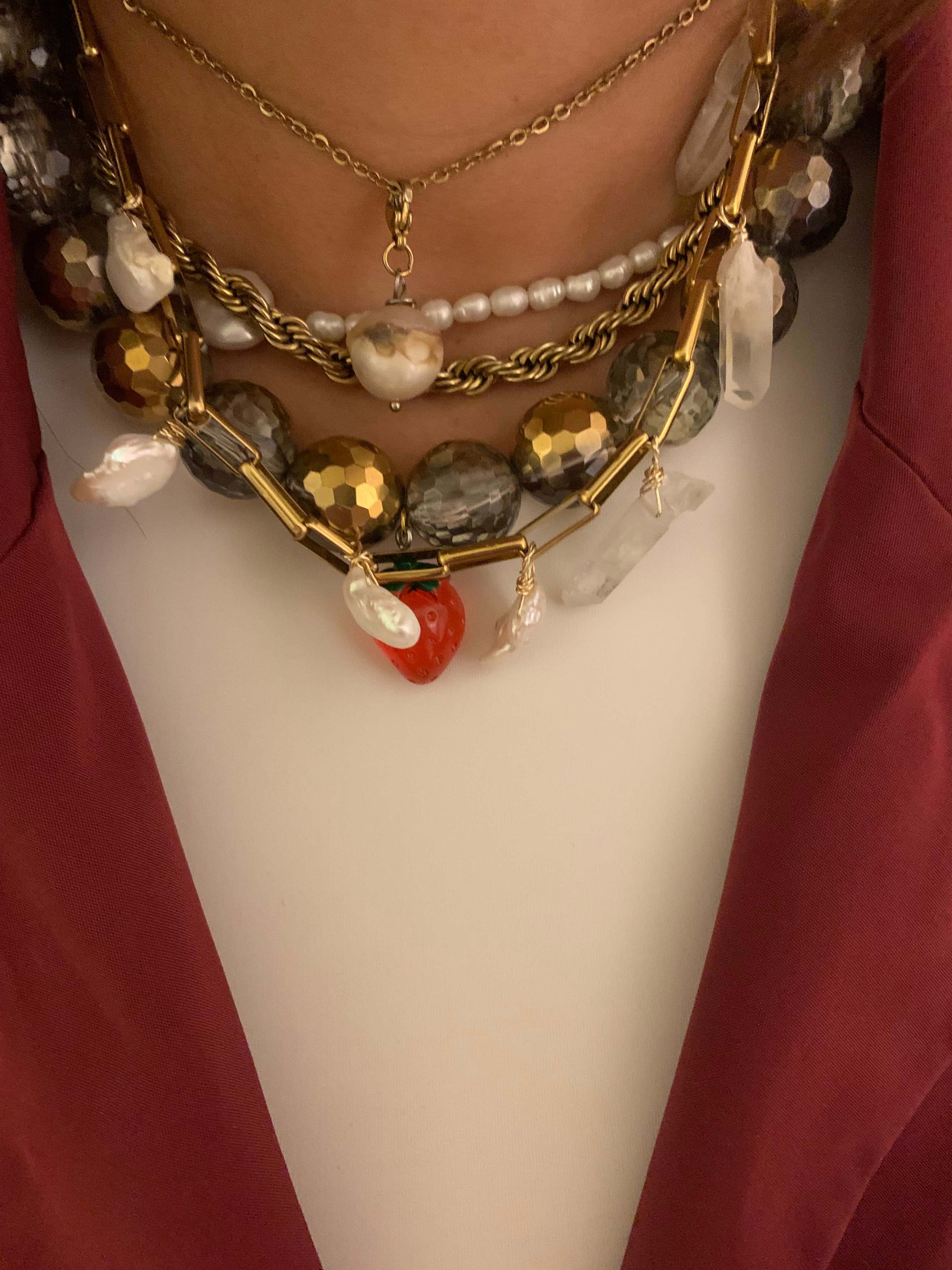 Descubre la elegancia del collar Cuarzo Chuncky. Hecho de acero inoxidable y cuarzo transparente, este collar chunky añadirá estilo a cualquier atuendo. Con perlas de tamaño “16”, es una pieza única y elegante que complementará tu look con un toque de sofisticación.