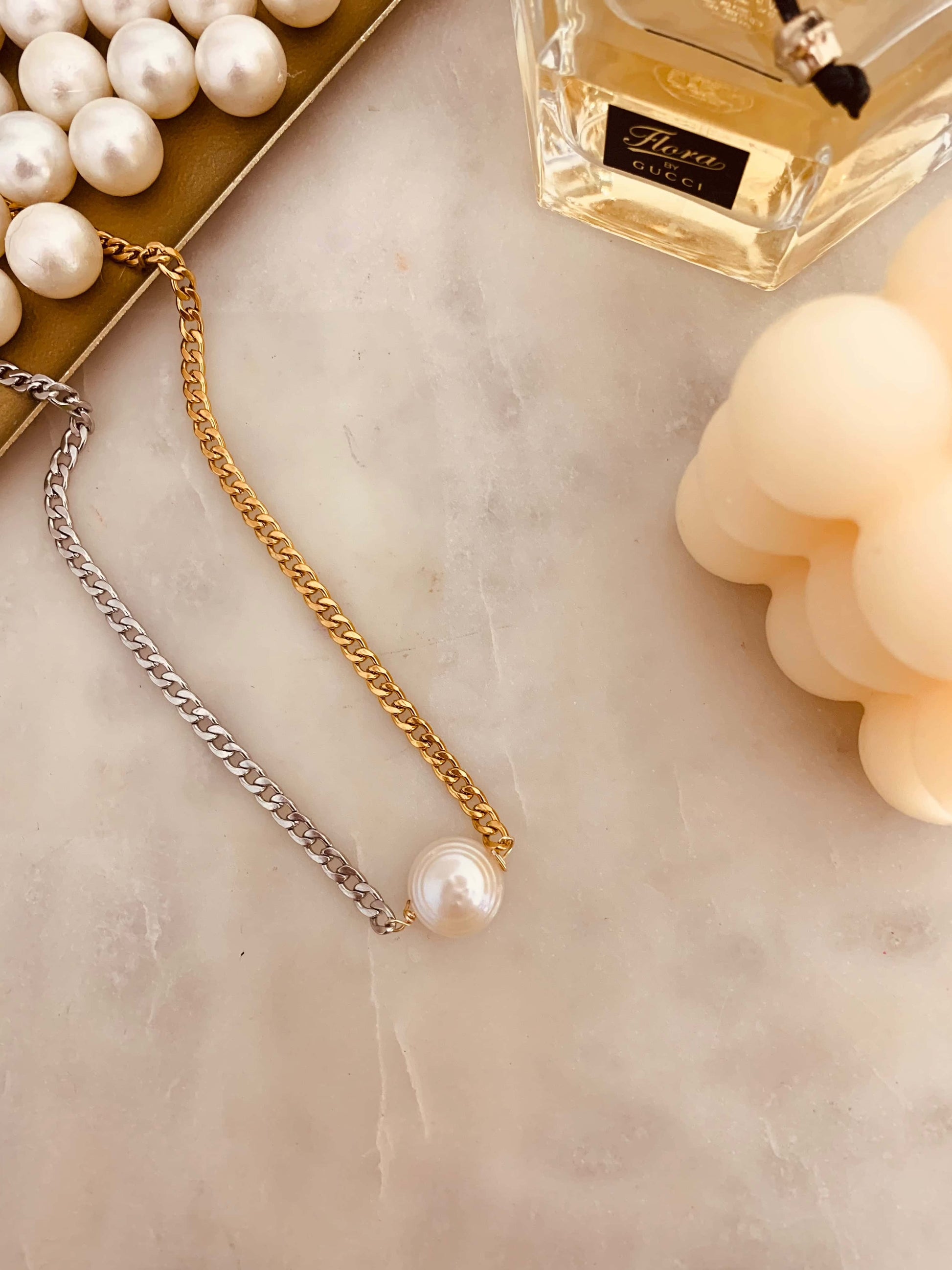 Delicada Cadena elaborada a mano con perla cultivada y acero inoxidable. Tamaño 16”
