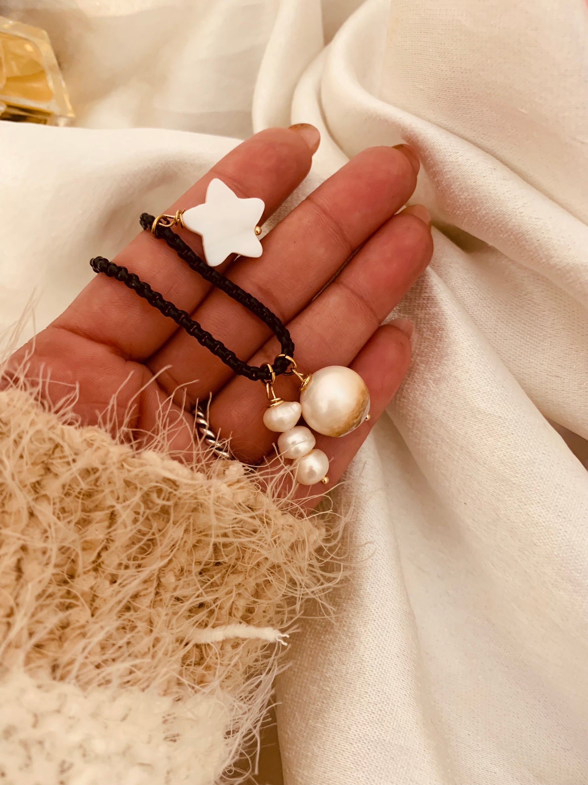 Este collar Estrella Negra es perfecto para cualquier ocasión. Hecho a mano con dijes de cielo Perla barroca, este elegante collar es ajustable con un extensor, lo que permite un ajuste perfecto para cualquier persona. La estrellita en el centro añade un toque celestial a cualquier atuendo.
