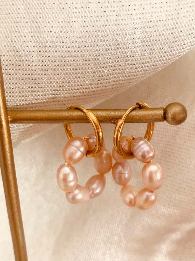 Delicados pendientes elaborados a mano con perlas cultivada peach y acero inoxidable. Tamaño Mediano.