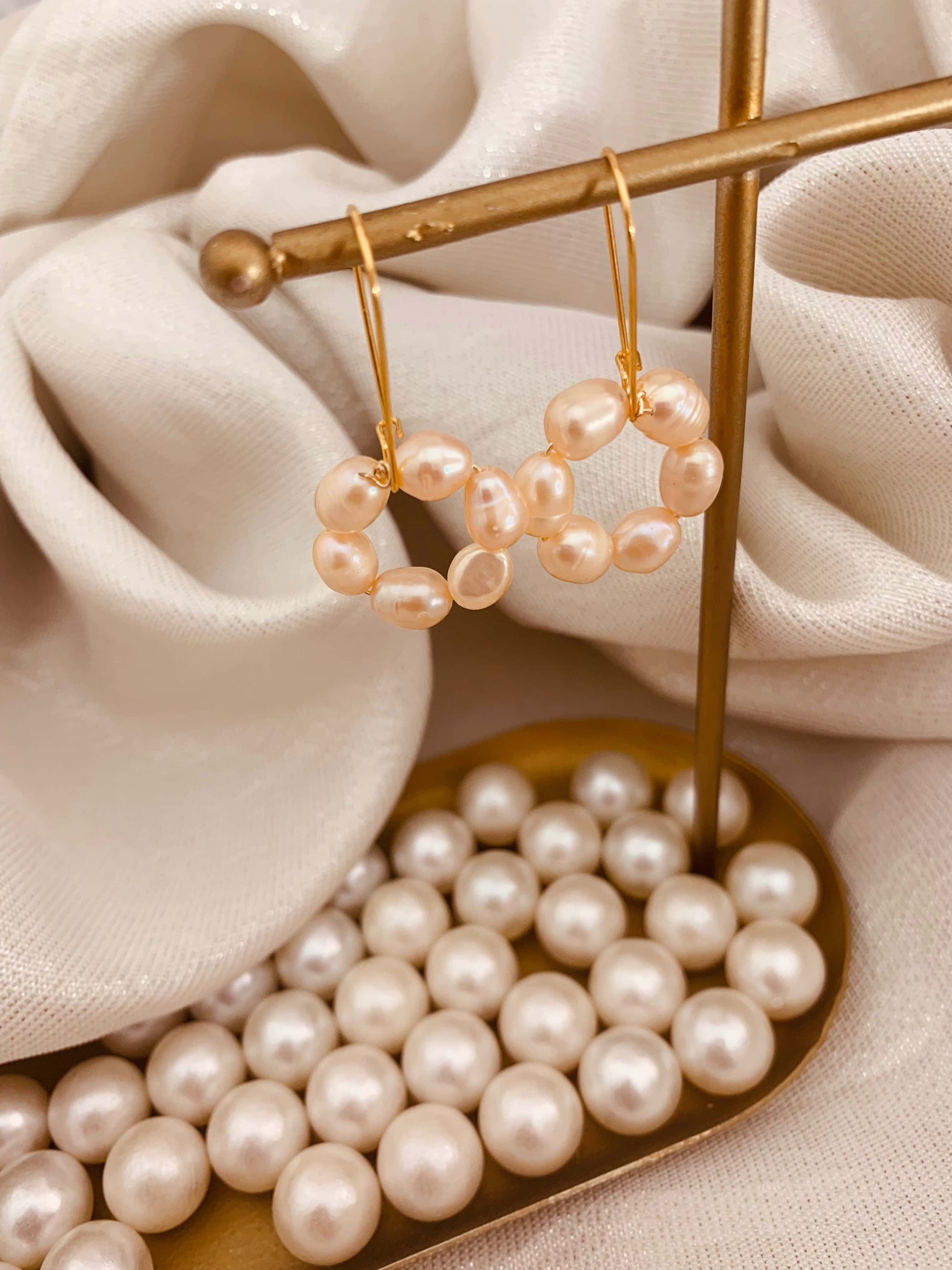 Delicados pendientes elaborados a mano en acero inoxidable y perlas color peach. Estos pendientes son exclusivos de VIAGGI MODA. Si amas la exclusividad, estos pendientes son para ti.