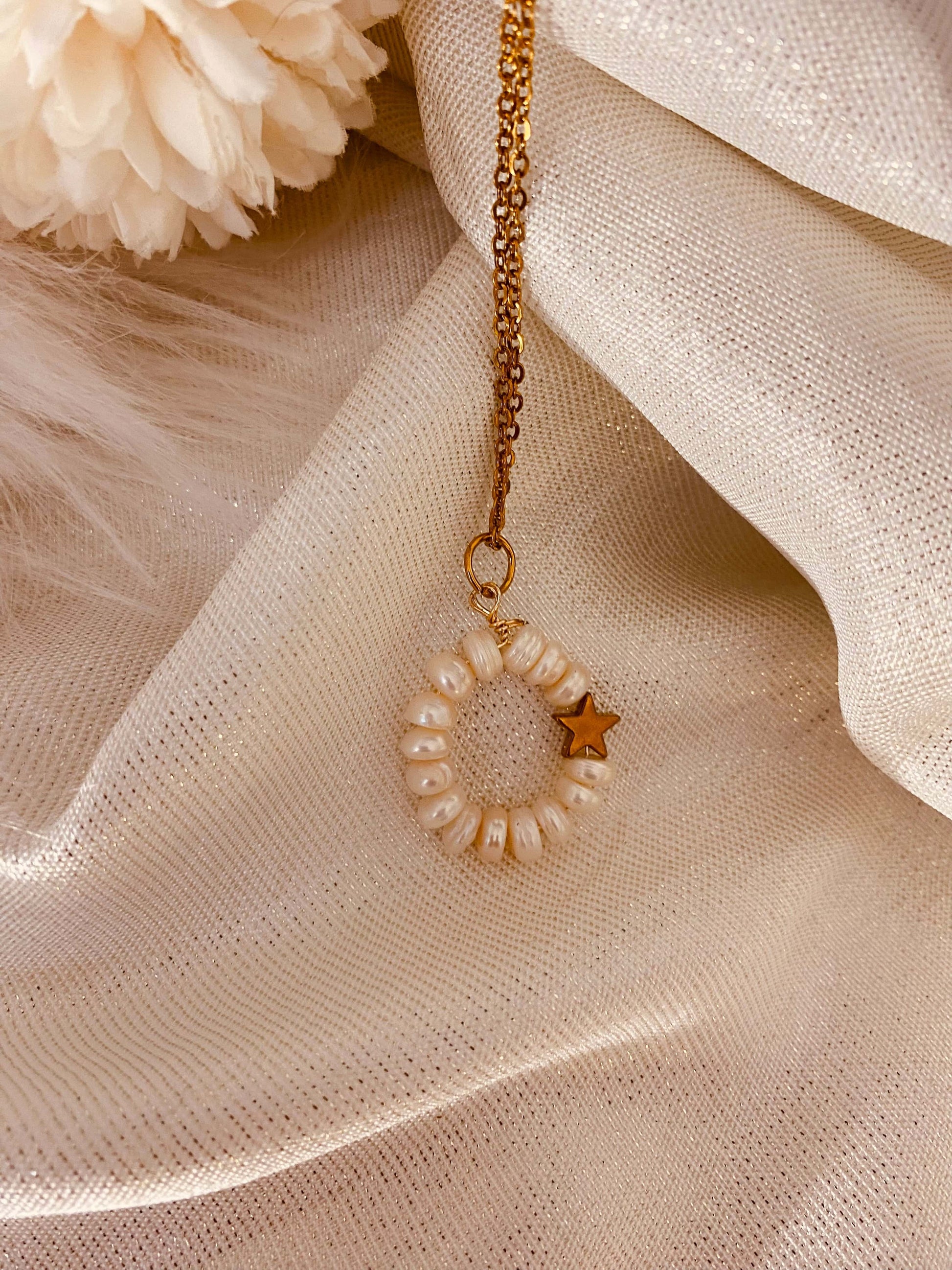 Delicada Cadena con aro de perlas naturales y detalle de Estrella en hematita. Largo 45cm