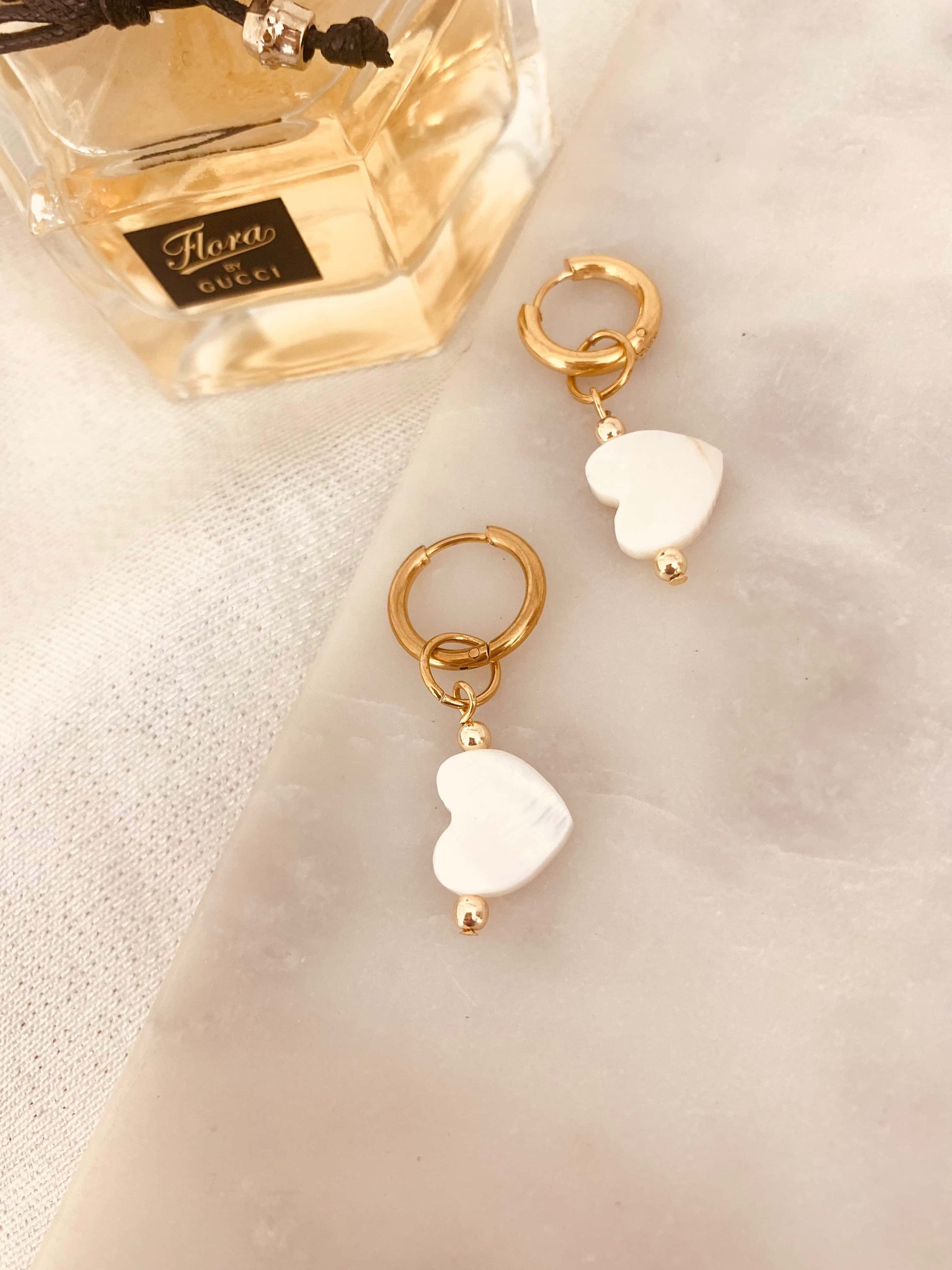 Delicados pendientes elaborados a mano con corazón en Shell y acero inoxidable. Tamaño mediano