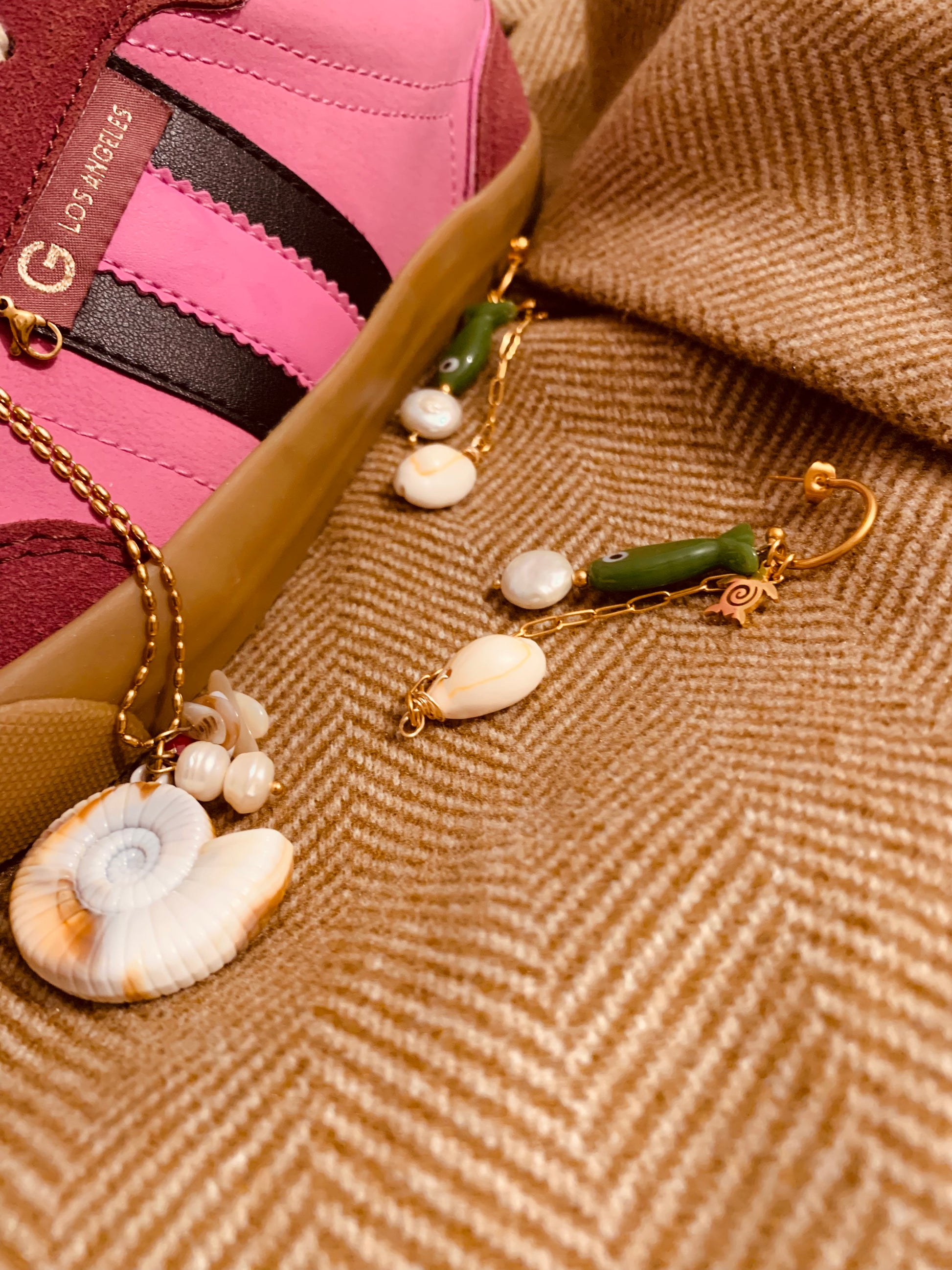 Hecho de acero inoxidable, los Pendientes de Pez Verde son una tendencia de moda. Cada par viene con dijes de paz, caracol y tortuga, lo que los hace versátiles para usar a diario. Agrega un toque de paz y estilo a tu atuendo con estos elegantes pendientes de pez.