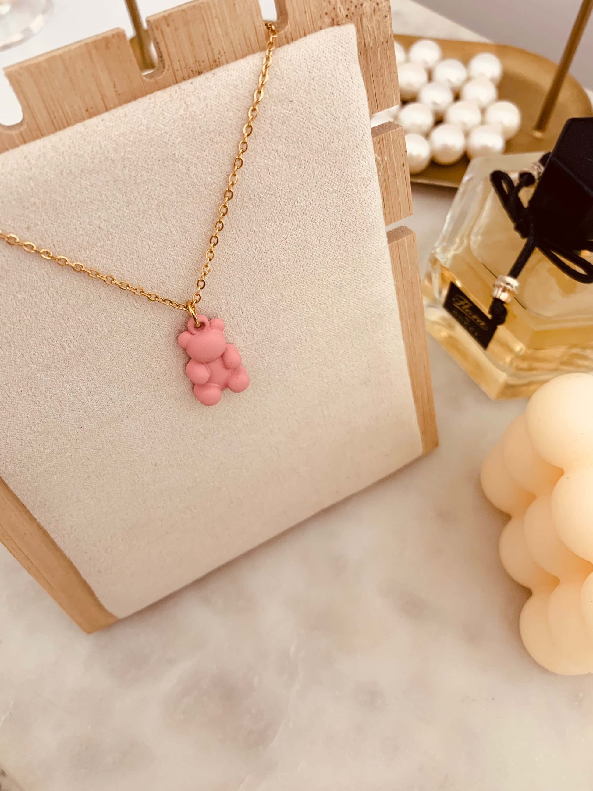 Cadena en tendencia de osito rosado. Ideal para la Tercera capa de Layering. Esta también es una buena opción para regalar a una niña.