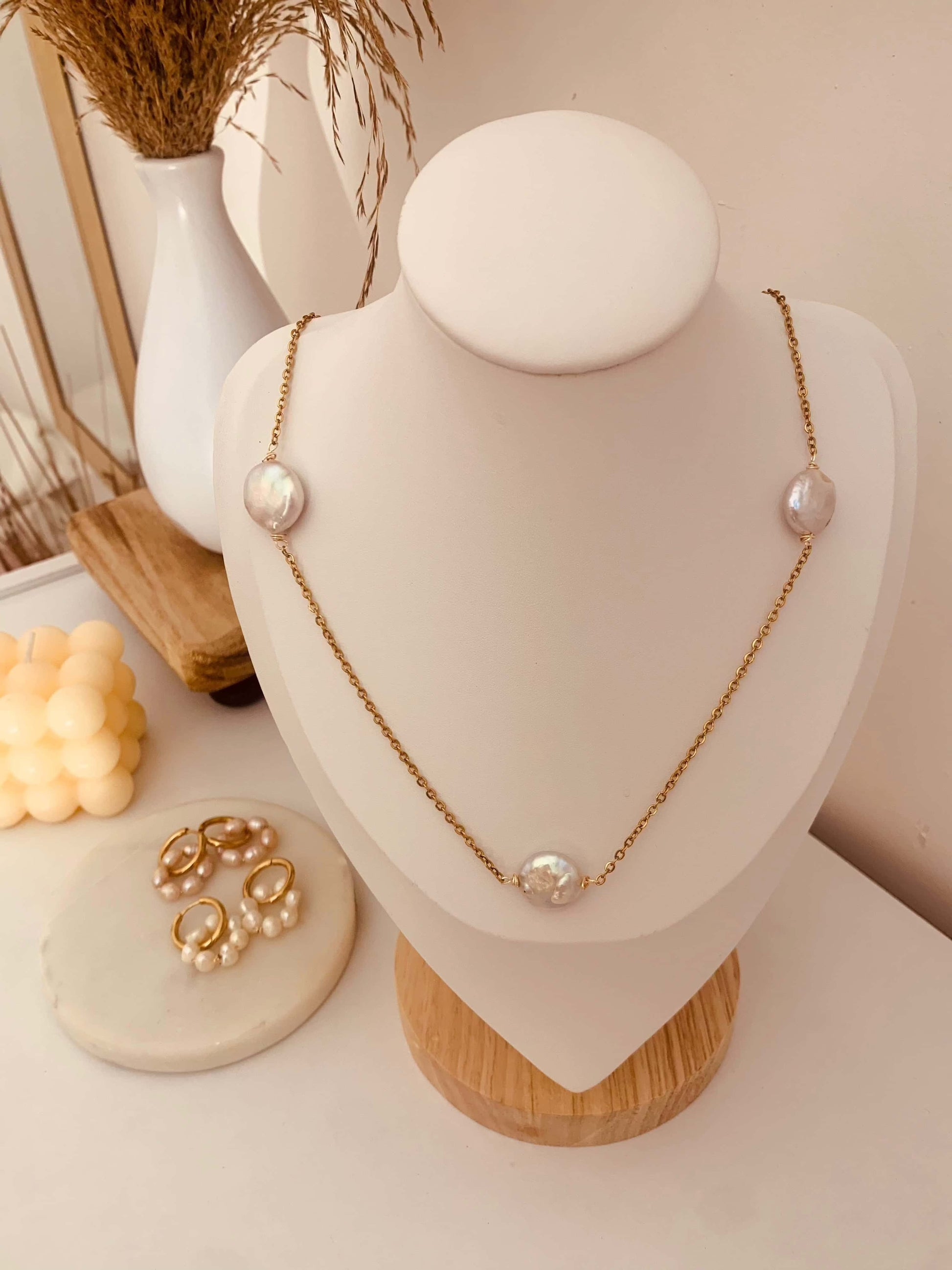 Delicado collar en acero inoxidable y perlas cultivadas . Este collar será el complemento Perfecto para top de cuello alto o cuello redondo. Tamaño 21”