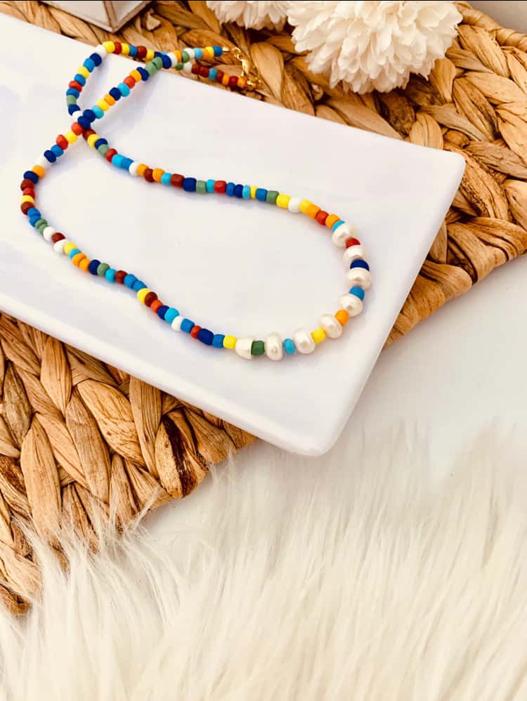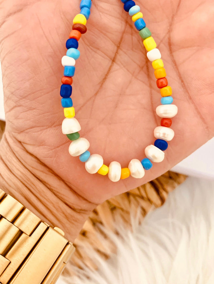 Delicado collar colorido elaborado a mano con perlas cultivadas. Ideal para vestimenta casual, combina con tus vaqueros favoritos. Tamaño 19”