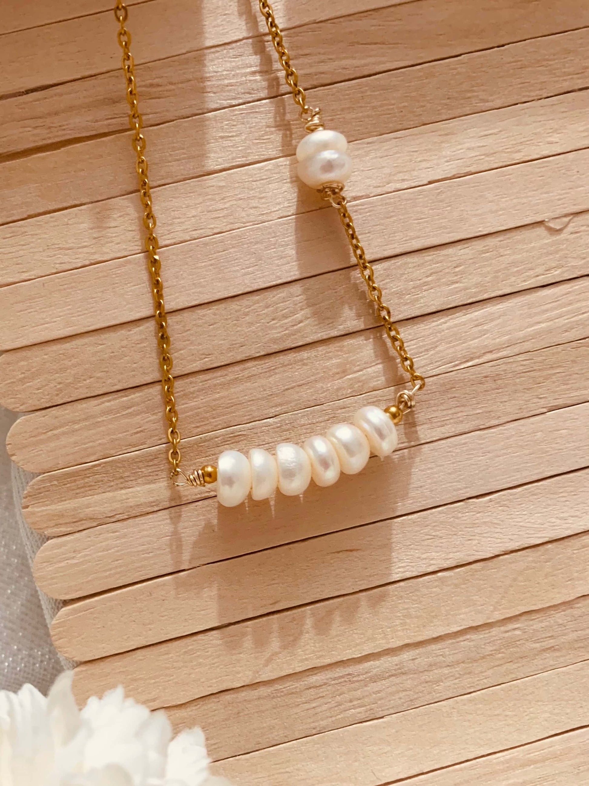 Delicado collar elaborado a mano en acero inoxidable y Perlas naturales. Las perlas siempre dan un toque de elegancia. Combina con otros y crea layerings dando un toque casual. Esta es una buena opción para un regalo a madre, hermana.