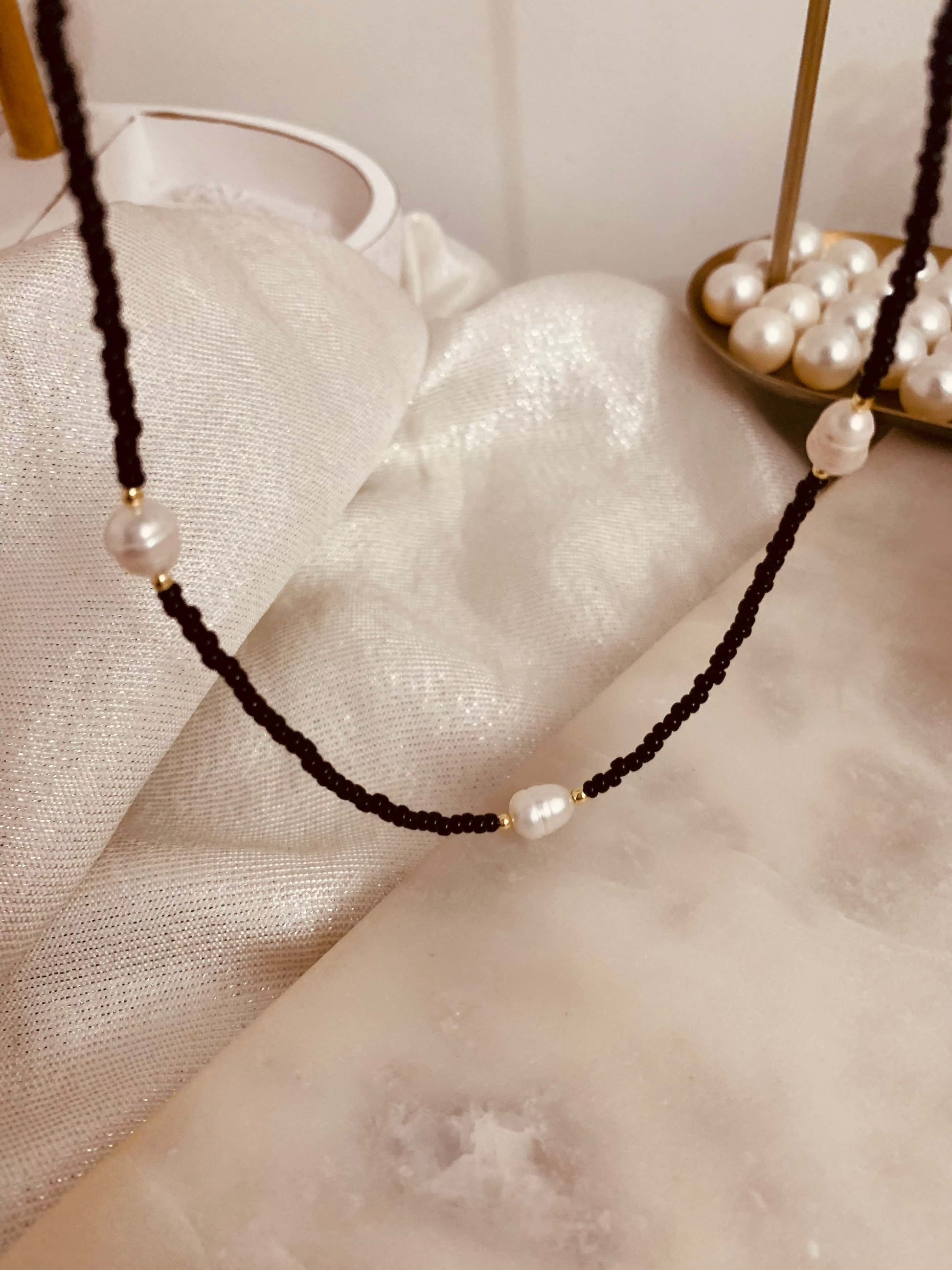 Delicado collar negro elaborado a mano con perlas cultivadas. Tamaño 16”