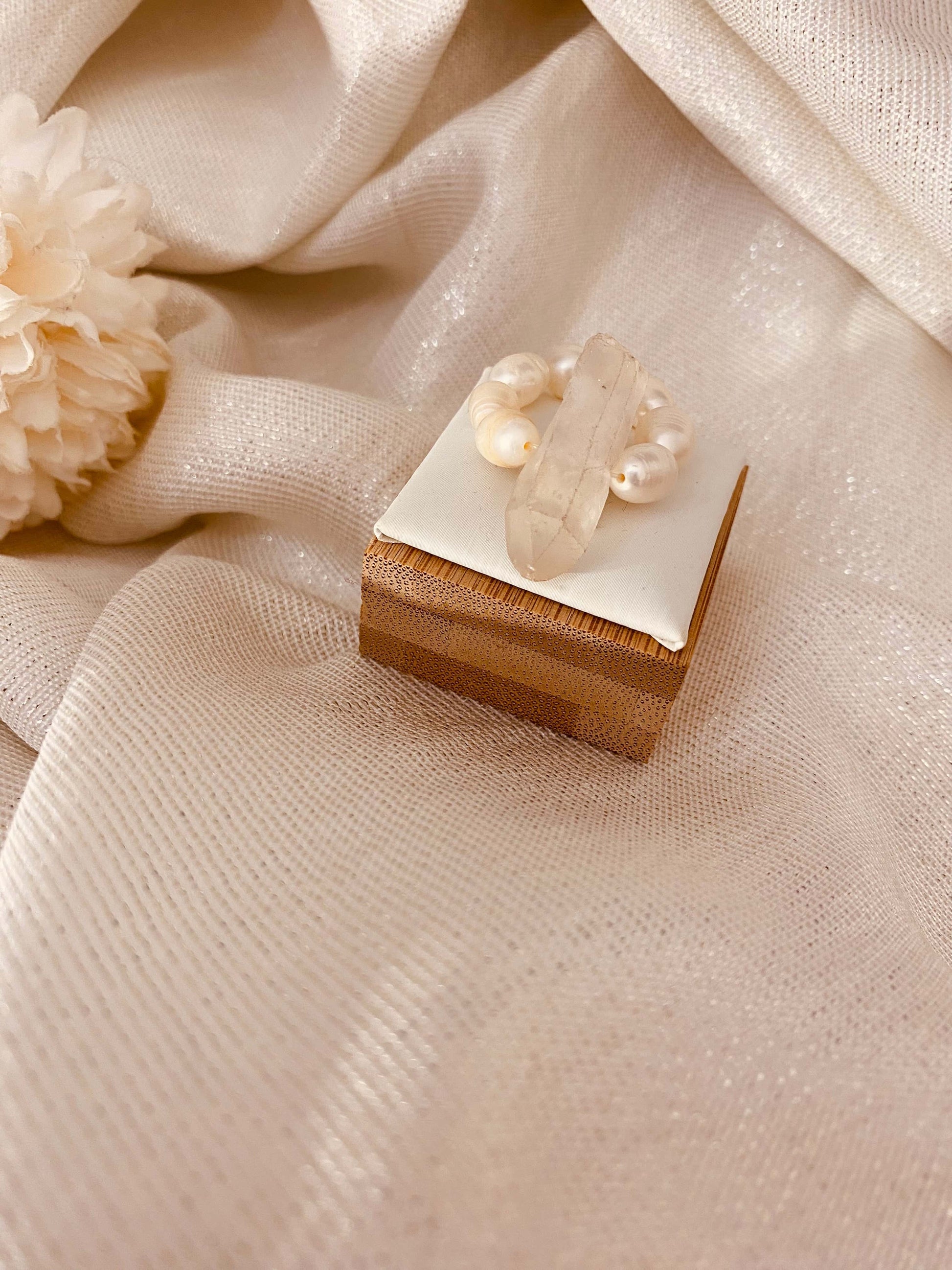 Delicado anillo elástico elaborado en Perlas y detalle romántico en cuarzo. Size 7