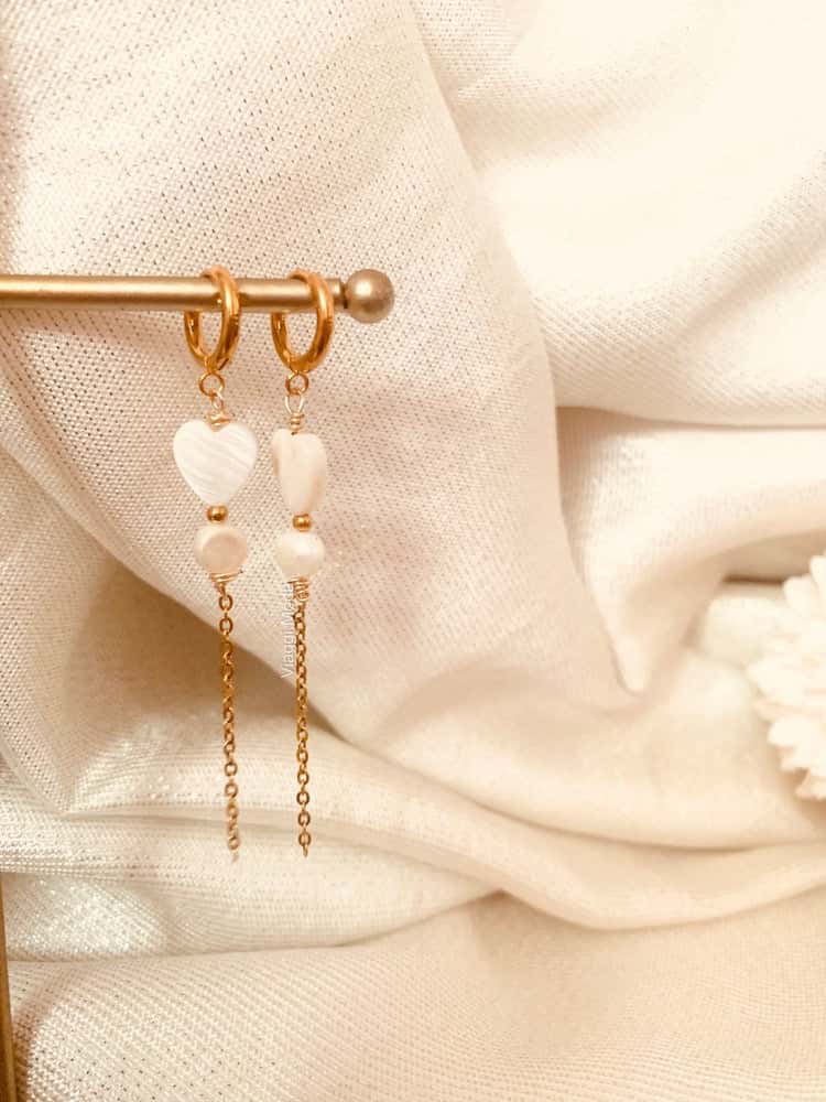 Delicados pendientes en acero inoxidable y corazón nácar. Ideales para vestimenta casual. Estos pendientes son exclusivos de VIAGGI. Si amas la exclusividad y dar un toque único a tu outfit estos pendientes son para ti. Ideales para regala a amiga o hermana.