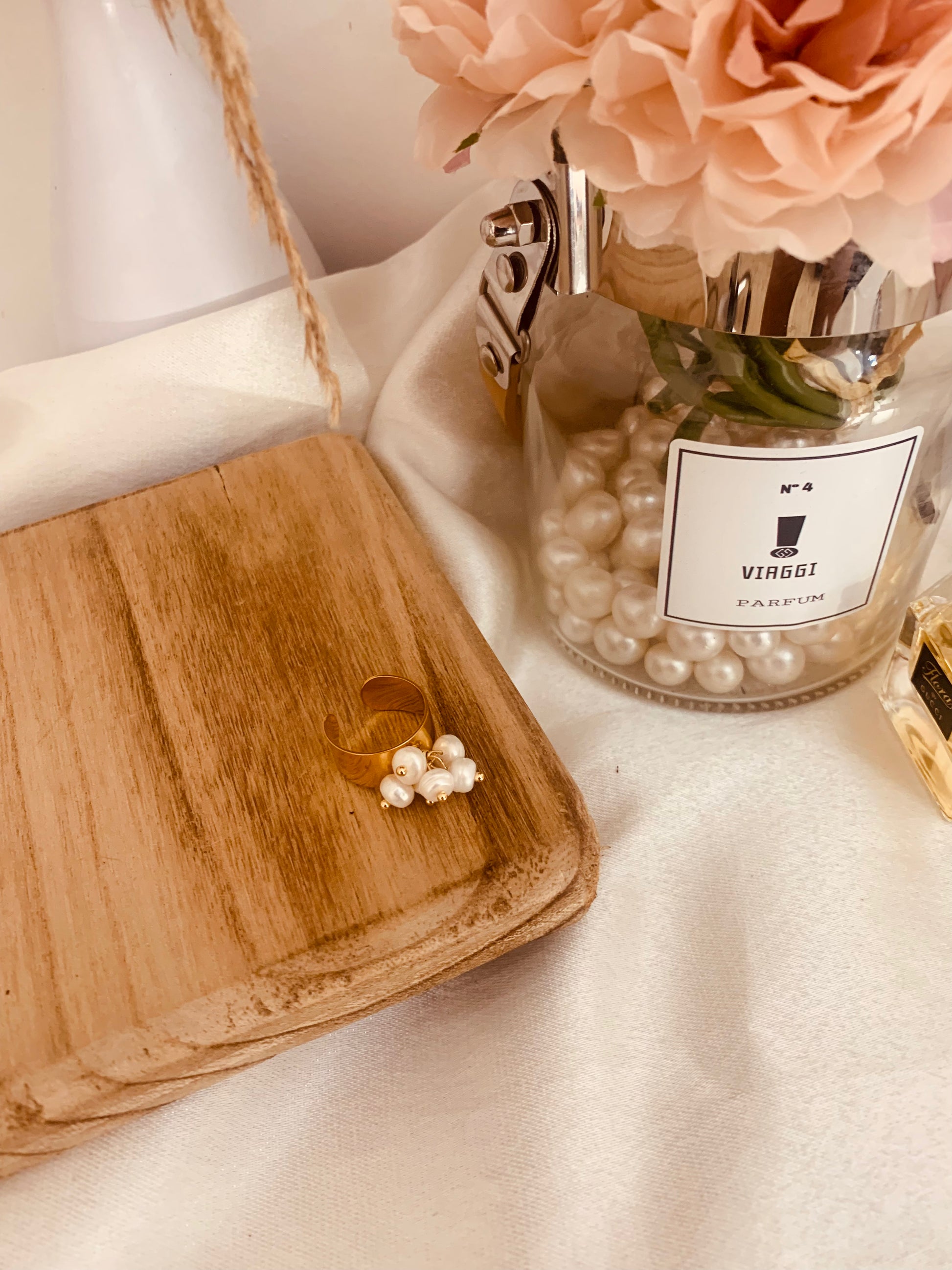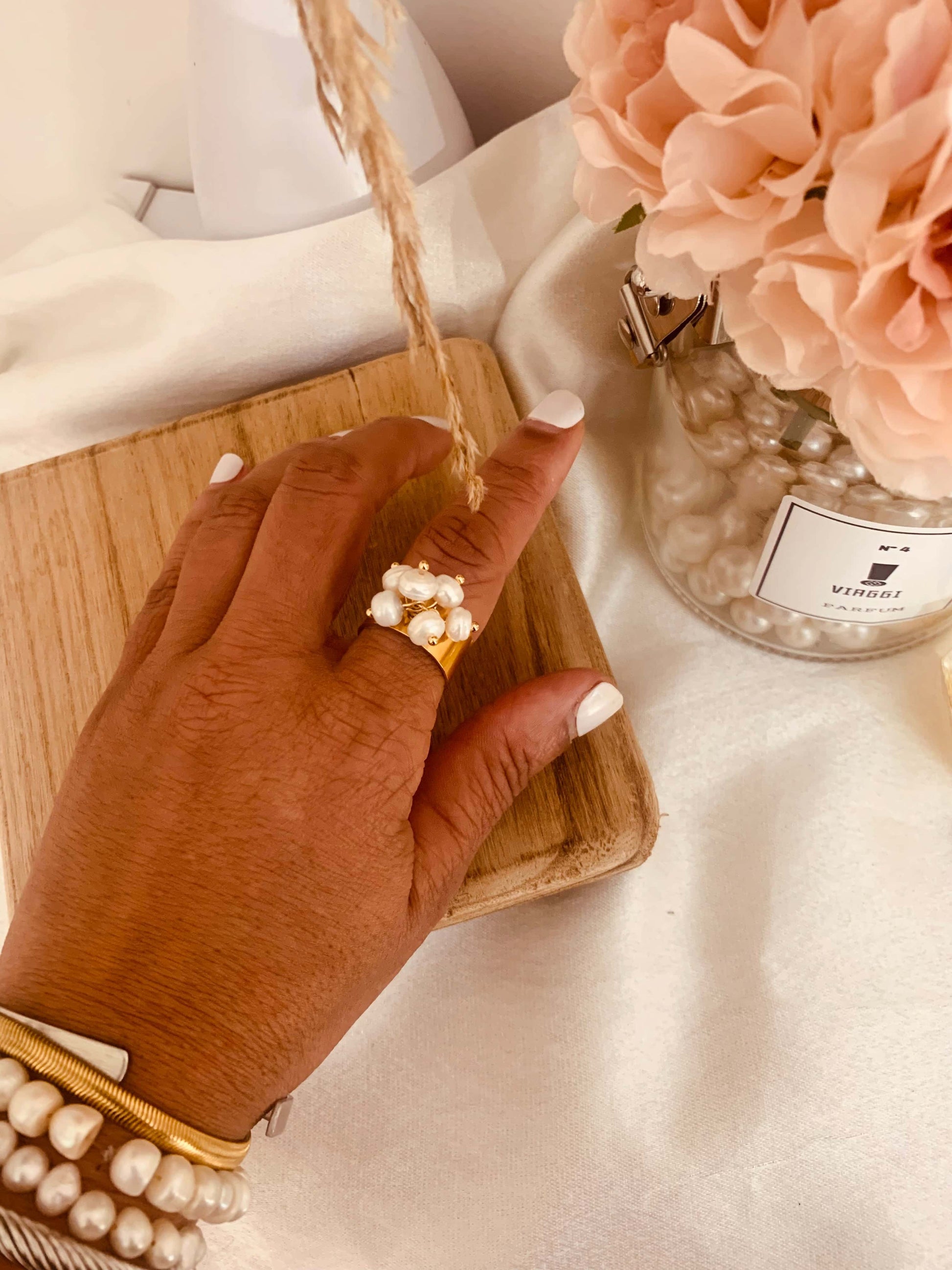 Añade un toque femenino a tu look con este anillo elaborado con perlas naturales y acero inoxidable.