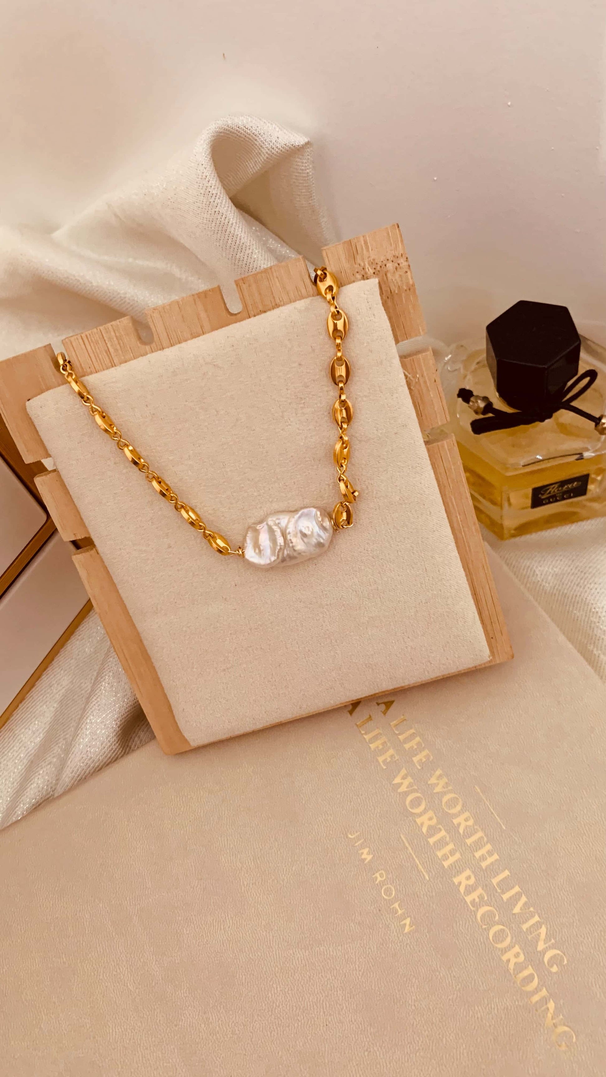 Delicado collar en acero inoxidable y perlas cultivadas. Tamaño 16”
