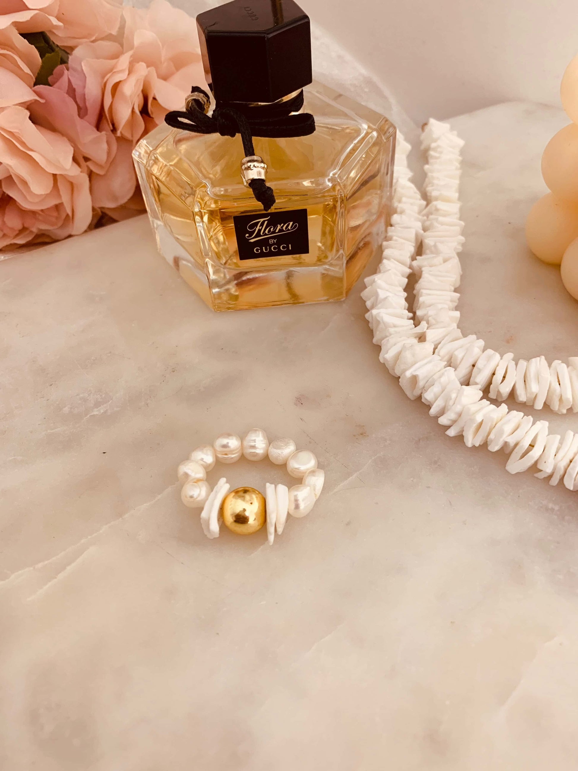 Delicados anillo elaborado a mano con Shell blanco y Hematitas. Puedes combinar collar y pantallas . Los consigues como Sky en Search.