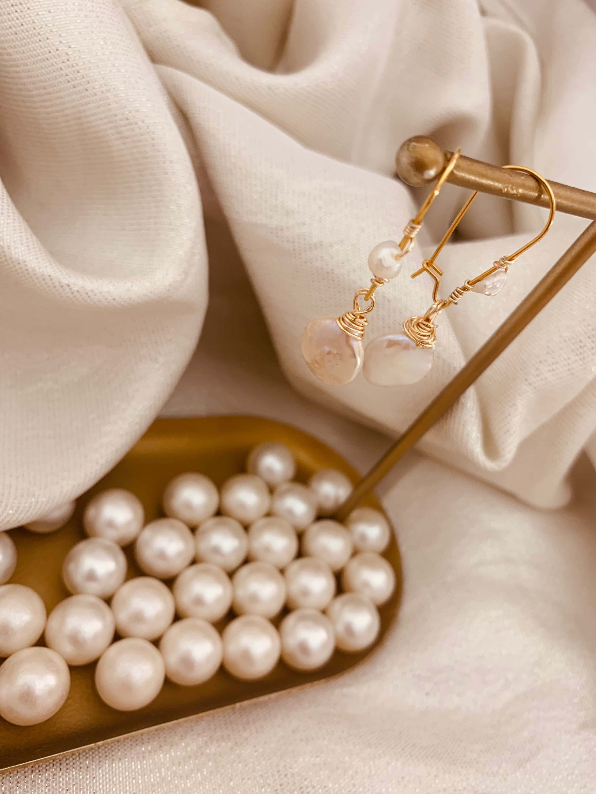 Delicados pendientes elaborados a mano con perlas alambradas en acero inoxidable. Ideal para vestimenta formal. Requiere cuidado.