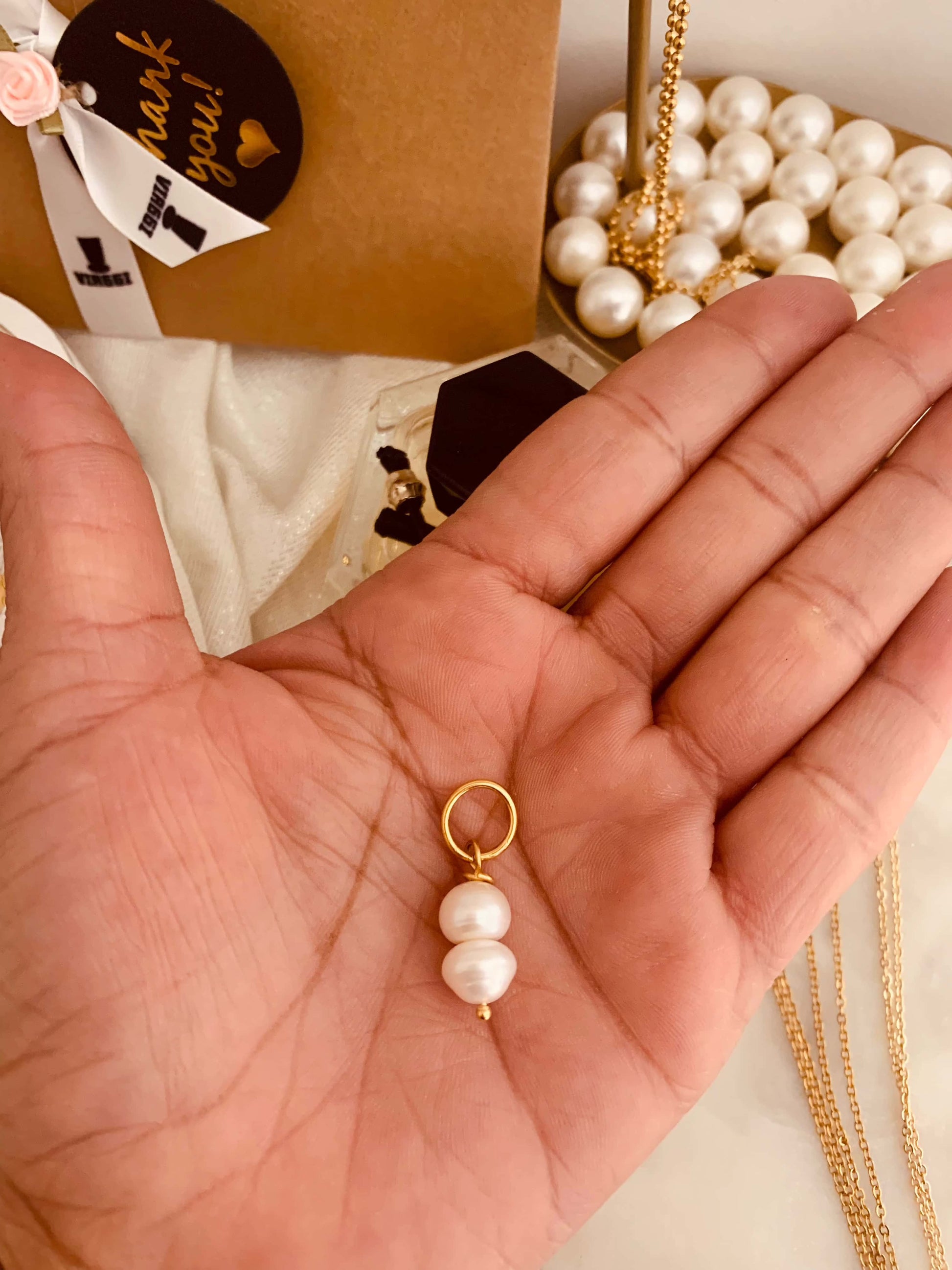 Delicado charm elaborado a mano con perlas cultivadas y acero inoxidable. Ideal para cadenas o pulseras.