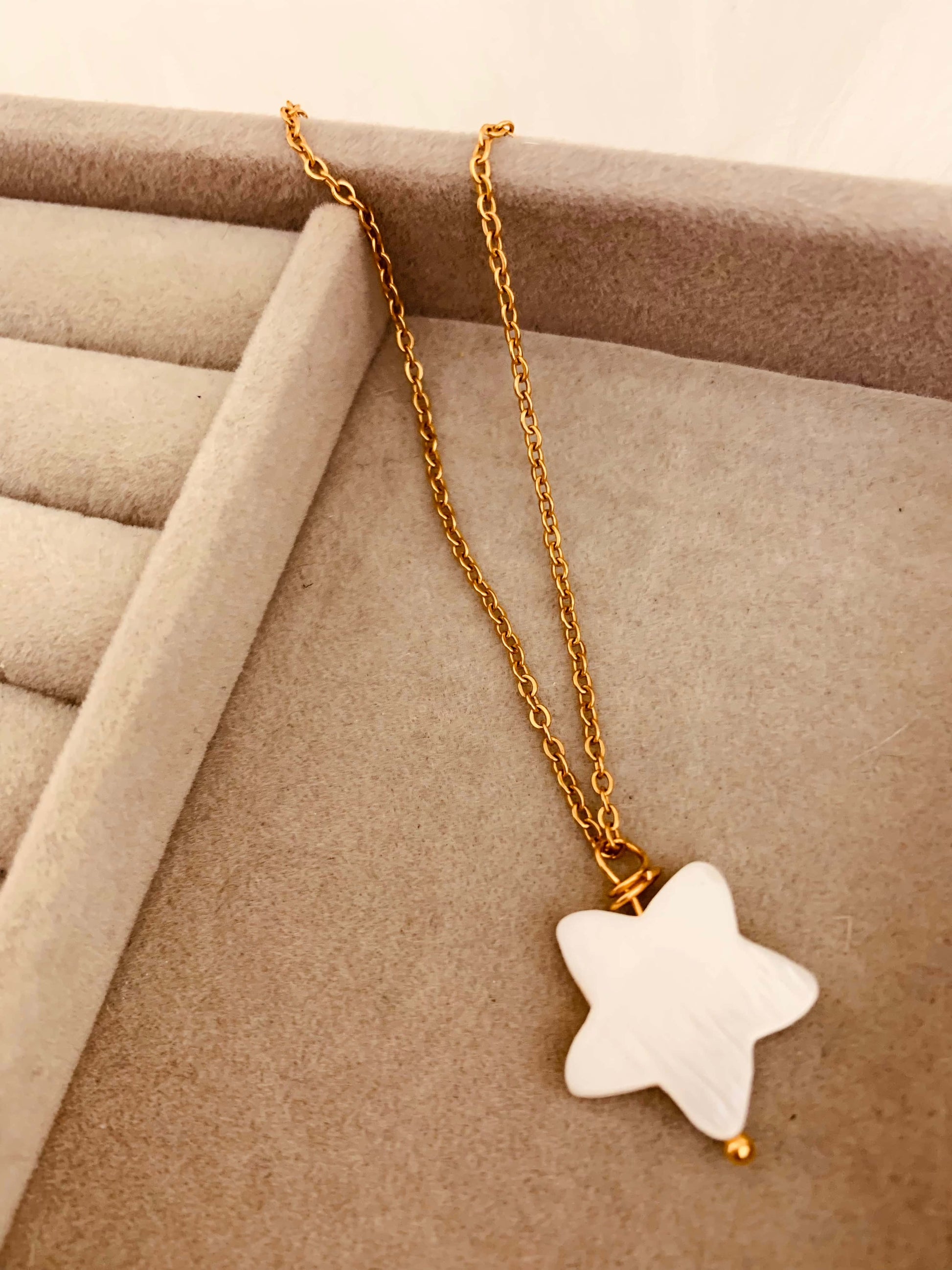 Delicada cadena en acero inoxidable y Estrella en Shell. Tiene extensor