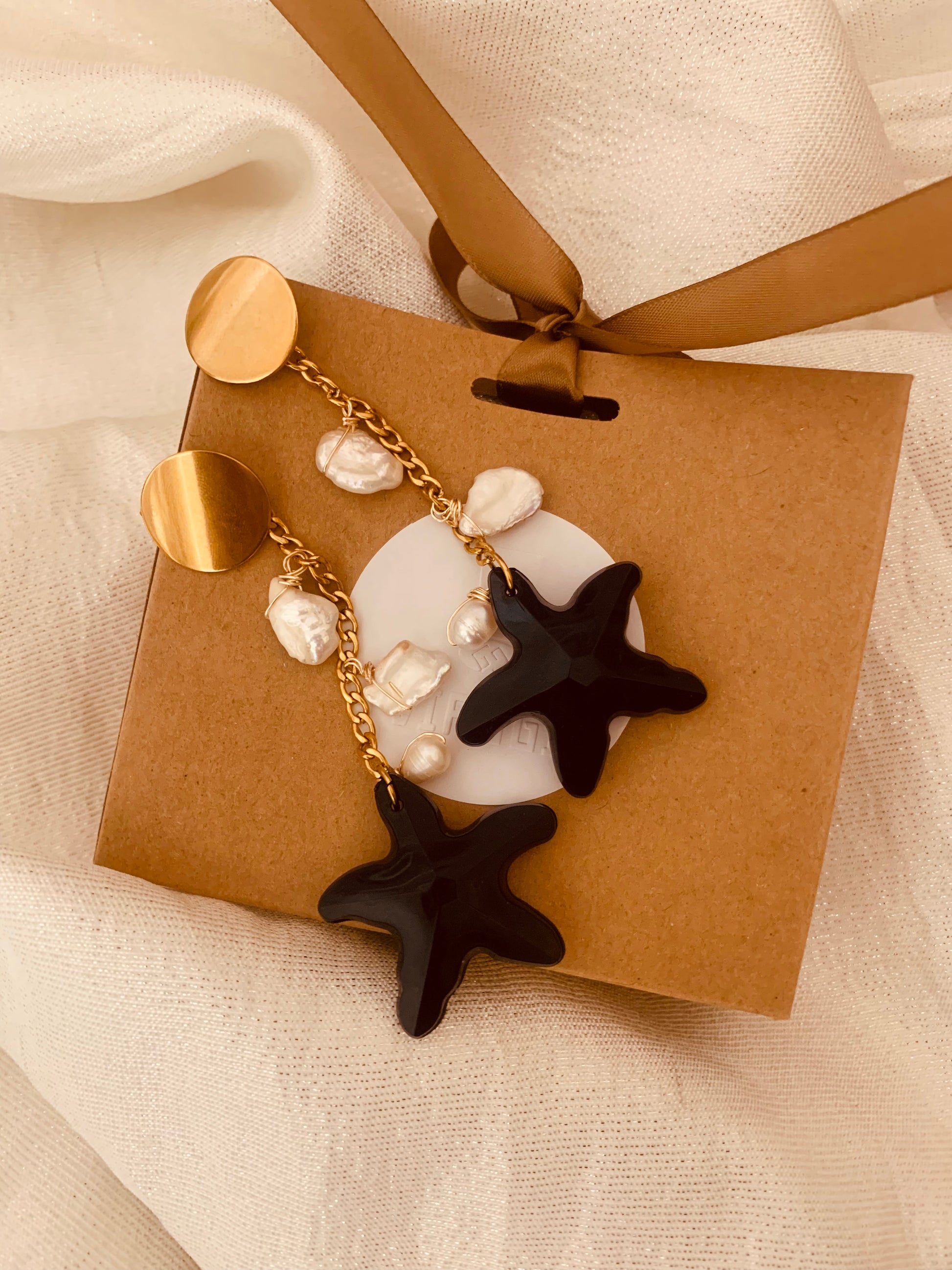 Estos hermosos aretes cuentan con una elegante Estrella negra en pantallas de acero inoxidable, brindando una combinación perfecta de estilo y durabilidad. Añade un toque de sofisticación a cualquier atuendo con estos aretes de alta calidad.