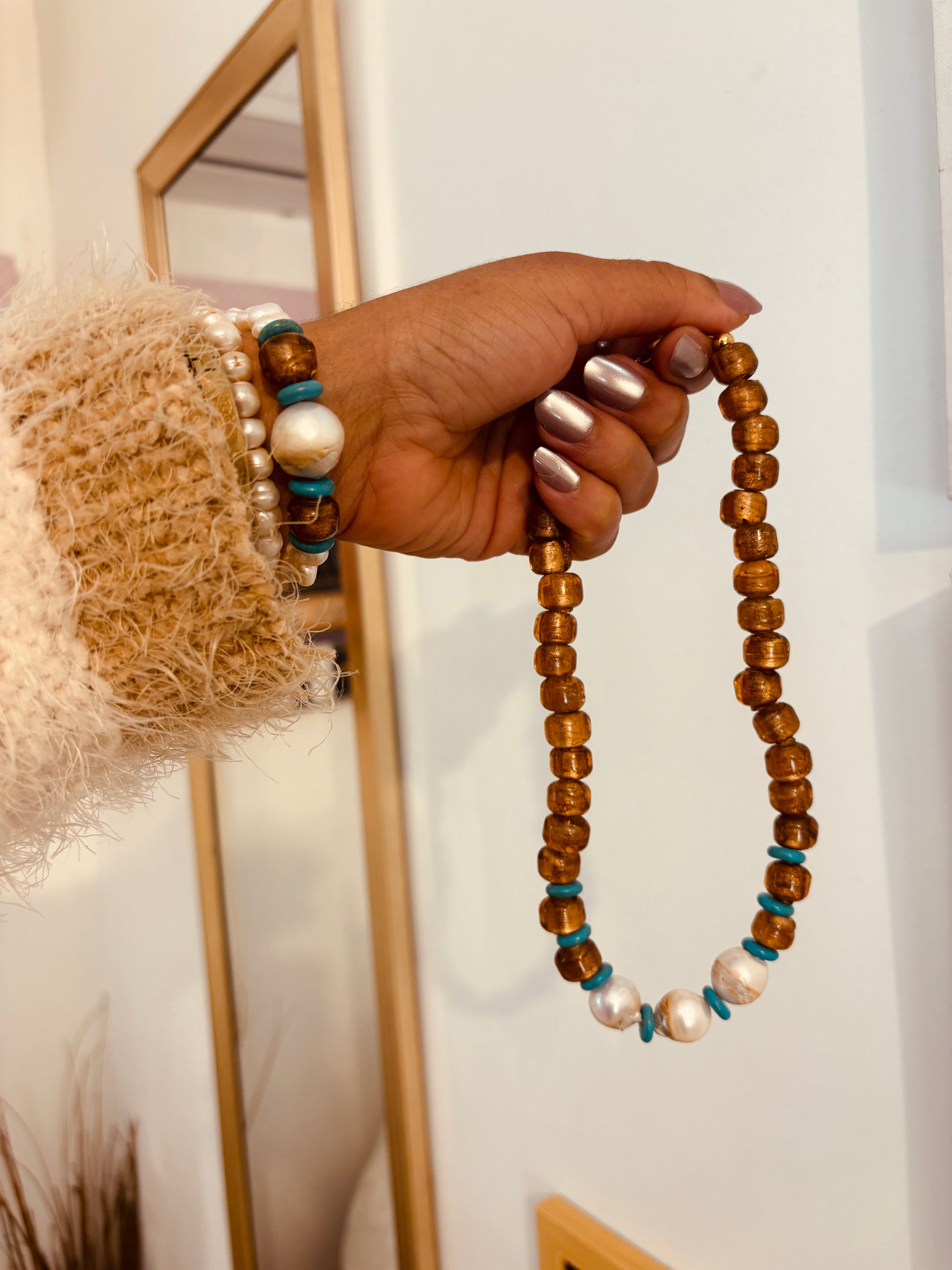 Descubre la elegancia de nuestra collar de piedra africana con perlas barroca de tamaño 16". Con su hermosa combinación de tonos marrón y perlas, esta pieza traerá un toque único a cualquier atuendo. Hecho a mano con materiales de alta calidad, este collar es una muestra de estilo y sofisticación.
