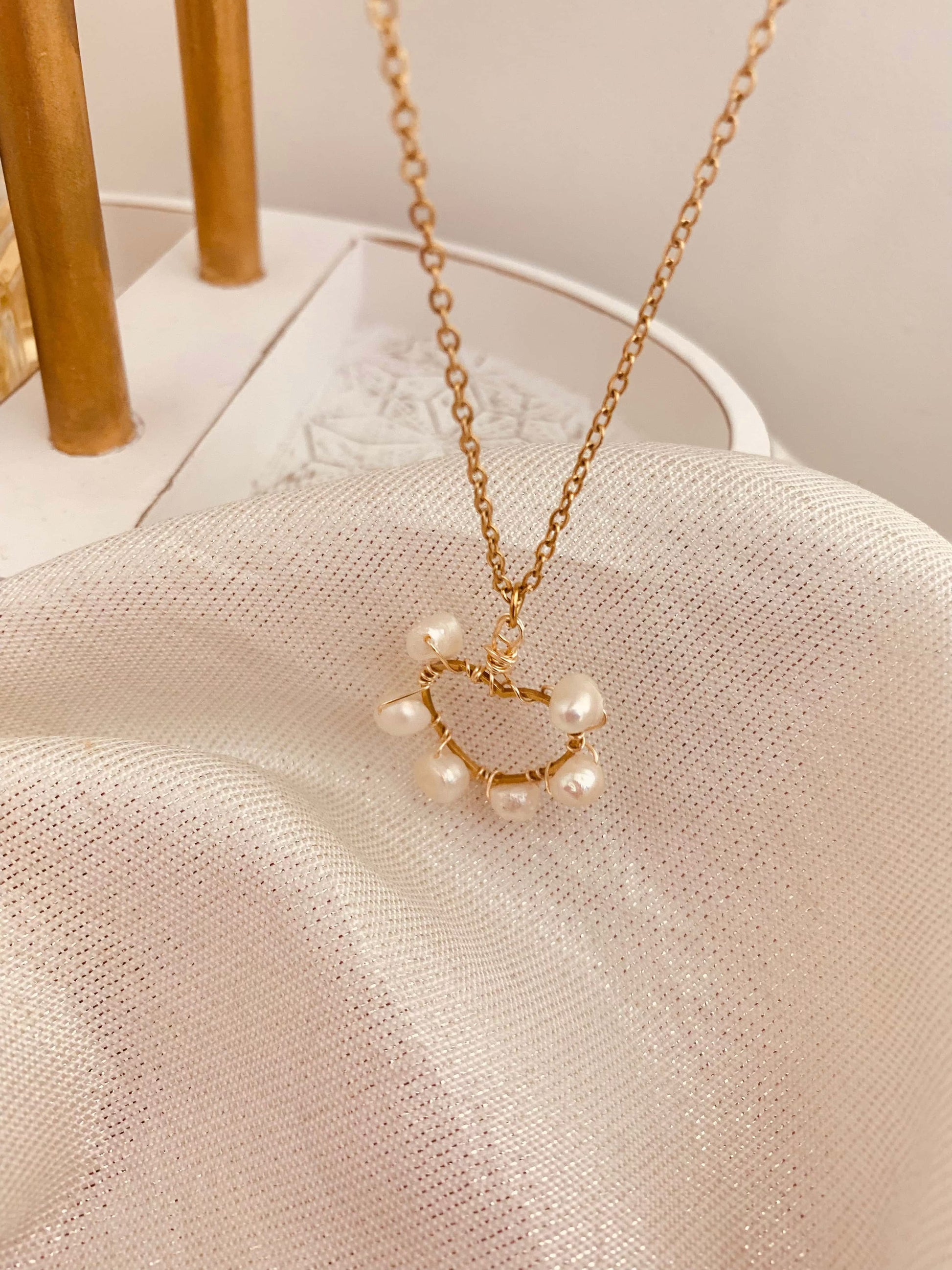 Delicado collar de corazón alumbrado con perlas y elaborado a mano en acero inoxidable. Ideal para cuarta capa de Layering. Tamaño 45 cm