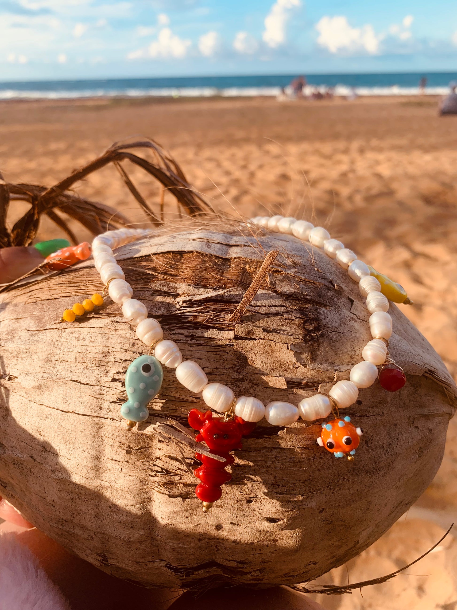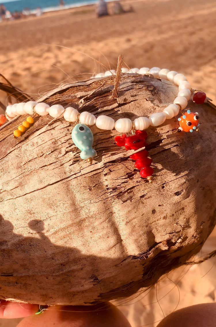 Explora el espíritu del verano caribeño con nuestro collar único y personalizado. Cada perla está cuidadosamente seleccionada y enhebrada a mano, mientras que el cierre de langosta garantiza su seguridad. Los peces de murano añaden un toque exclusivo que te hará destacar en cualquier ocasión. Sumérgete en el lujo del mar con este collar de perlas. Tamaño 16”